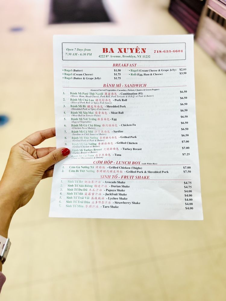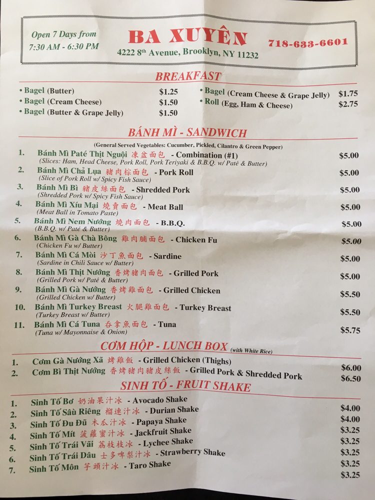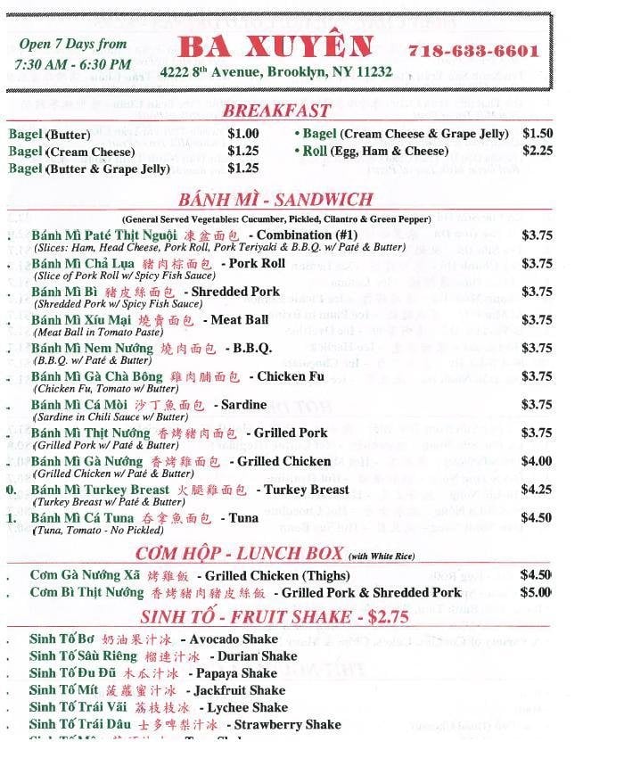 Ba Xuyen, located in Brooklyn, NY, is a Vietnamese restaurant specializing in sandwiches. This casual and cozy spot offers a range of delicious options, including the sardine banh mi and the #1 Banh Mi, both highly recommended by customers. Their menu features traditional Vietnamese ingredients like pate, ham, BBQ pork, and more. The bread used in their banh mi is particularly noteworthy for its perfect crustiness. Moreover, Ba Xuyen offers a variety of desserts, such as pandan jelly and coffee jelly, adding a sweet touch to the dining experience. With friendly staff and affordable prices, Ba Xuyen is a neighborhood favorite for those craving authentic Vietnamese flavors in a welcoming environment.